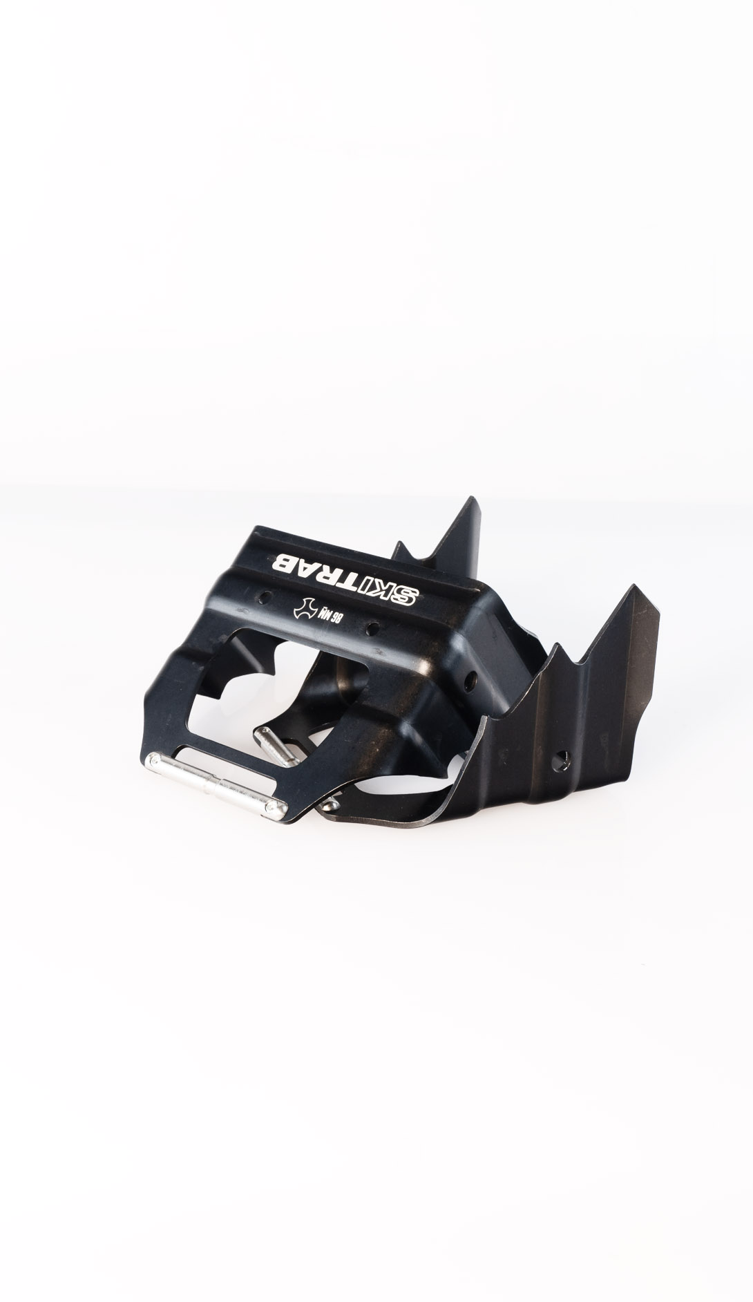 One simple component in titanium specially designed in its shape and structure links the two jaws in the toe unit. This extremely simple mechanism offers a significant guarantee of functionality and reliability. The toe unit jaws open with a light pressure on the front lever, which can be pressed either by hand or with a ski pole. Position the boot so that the jaw pins are level with the holes on the side of the boot, then release the lever so the jaws close locking the toe of the boot into place. Rotate the lever upwards to block the opening of the jaws. This special elastic component in titanium permits the toe unit to adapt perfectly to all types of boots, guarantees that the boot remains fixed in place and with the help of some particularly well finished and crafted pins it can clean out the boot inserts during use.